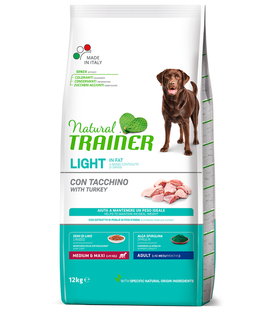 Trainer Natural Adult Light è un alimento secco completo - al gusto Tacchino - per cani adulti di taglia media e grande tendenti al sovrappeso.