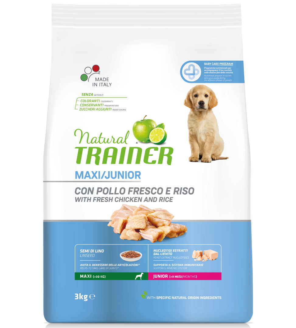 Trainer Natural Puppy&Junior Maxi al Pollo è un alimento secco completo - a base Pollo - per cuccioli di taglia grande e gigante (con peso superiore a 30 kg) da 2 ai 24 mesi d’età (Puppy: 1-8 mesi / Junior: 9-24 mesi).