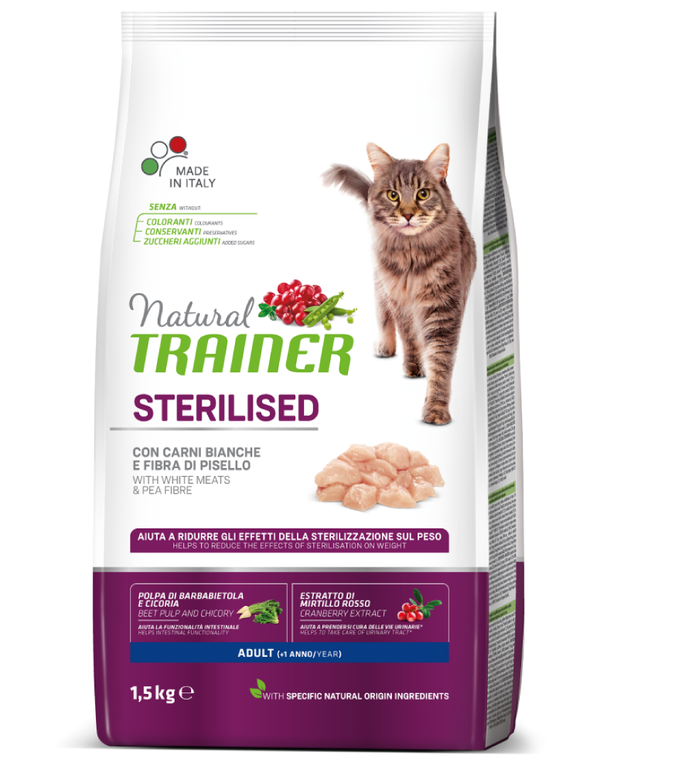 La linea di Trainer per gatti sterilizzati ha molti benefici: grazia alla formula per gatti sterilizzati, che include fibre vegetali, come la fibra di pisello, e un livello moderato di grassi, aiuta a ridurre il contenuto energetico del cibo; aiuta la funzionalità intestinale grazie ai prebiotici di origine naturale provenienti dall'estratto di radice di cicoria e dalla polpa di barbabietola; gli estratti di mirtillo rosso e di radice di cicoria di origine naturale e i livelli controllati di minerali aiutano a mantenere nel tempo il corretto funzionamento delle vie urinarie; l'estratto secco di mela e una speciale forma di vitamina C aiutano a prevenire la formazione di tartaro e a controllare l'alito cattivo.