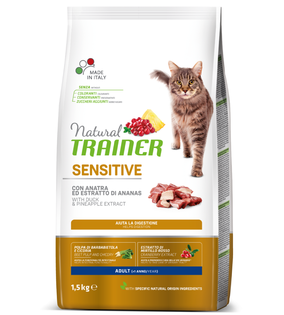 Aiuta la digestione dei gatti dallo stomaco delicato: la sua formula adattata contenente proteine di anatra di alta qualità facilmente digeribili, prebiotici ed estratto di ananas 100% naturale aiuta la funzionalità digestiva.