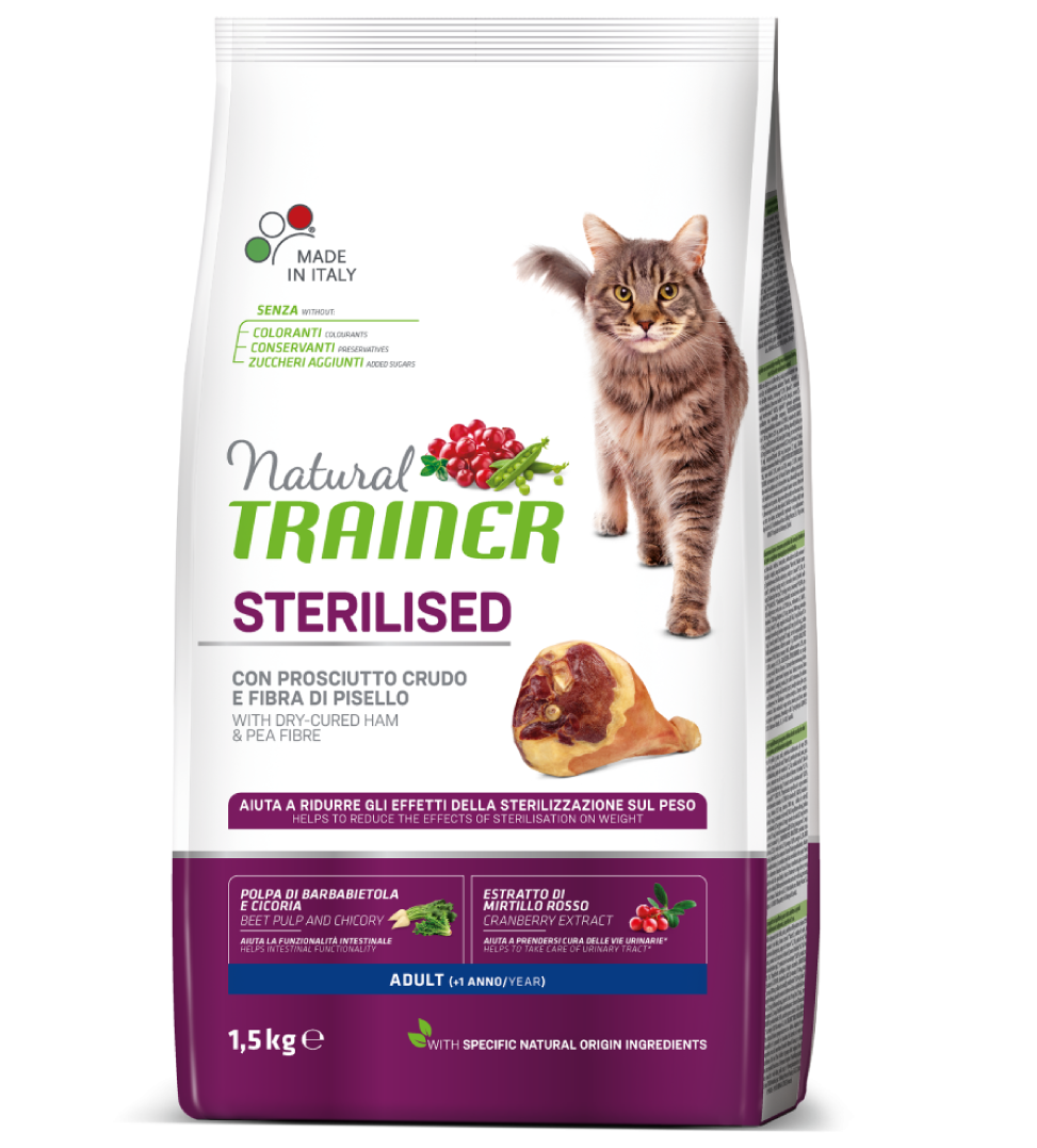 La linea di Trainer per gatti sterilizzati ha molti benefici: grazia alla formula per gatti sterilizzati, che include fibre vegetali, come la fibra di pisello, e un livello moderato di grassi, aiuta a ridurre il contenuto energetico del cibo; aiuta la funzionalità intestinale grazie ai prebiotici di origine naturale provenienti dall'estratto di radice di cicoria e dalla polpa di barbabietola; gli estratti di mirtillo rosso e di radice di cicoria di origine naturale e i livelli controllati di minerali aiutano a mantenere nel tempo il corretto funzionamento delle vie urinarie; l'estratto secco di mela e una speciale forma di vitamina C aiutano a prevenire la formazione di tartaro e a controllare l'alito cattivo.
