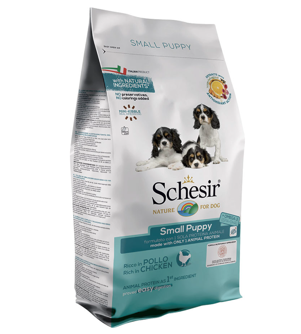 Alimento secco completo, con pollo, per cuccioli di cane di taglia piccola.