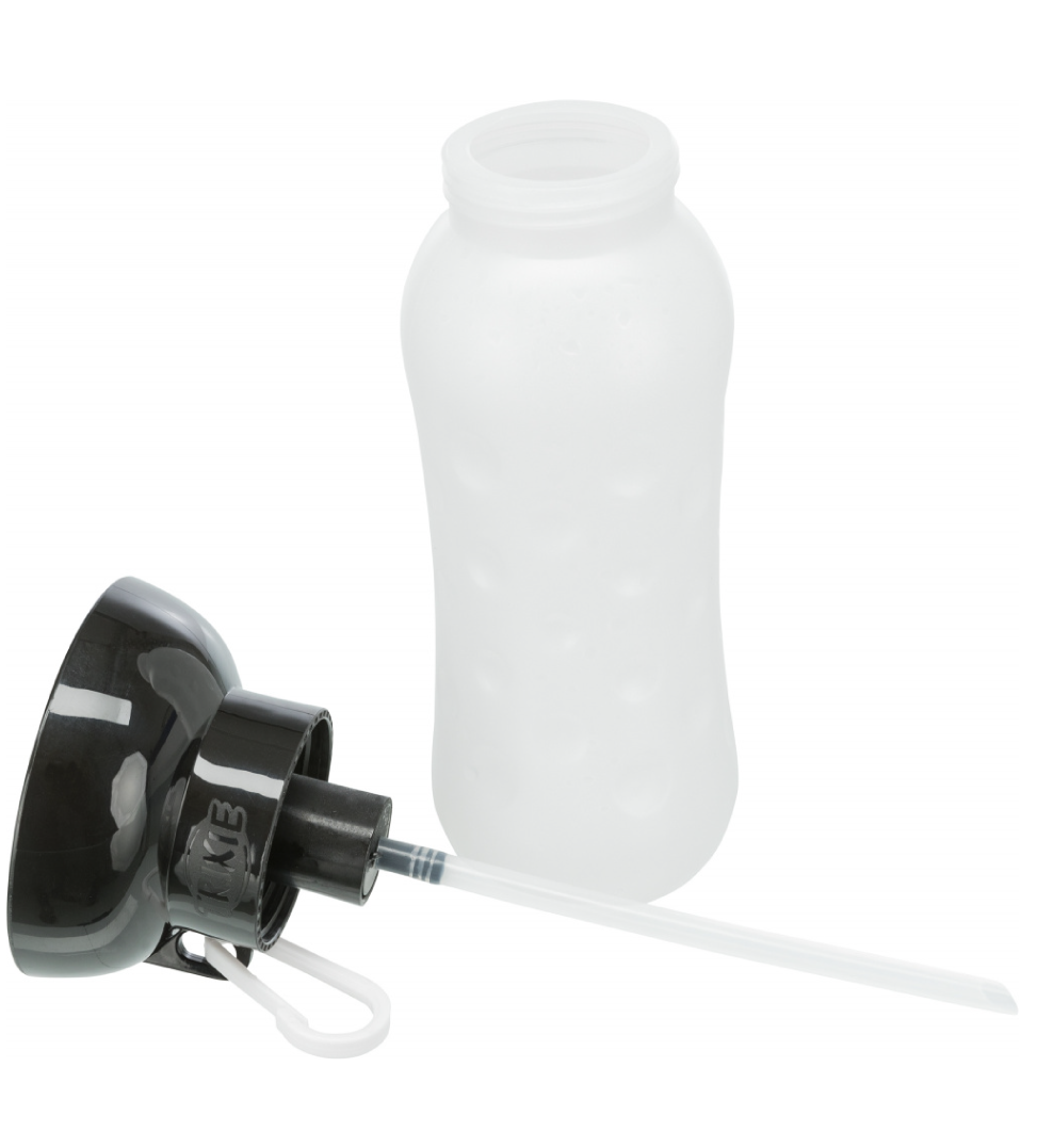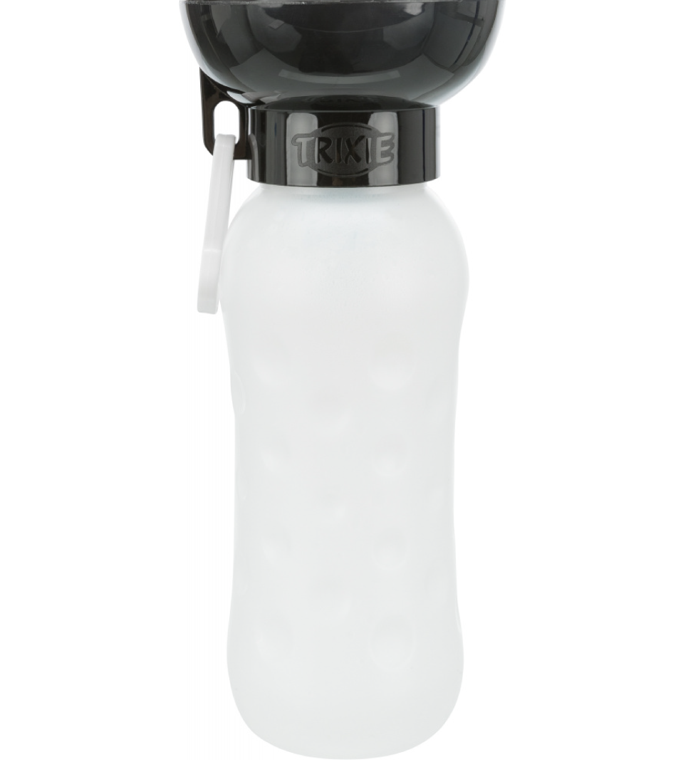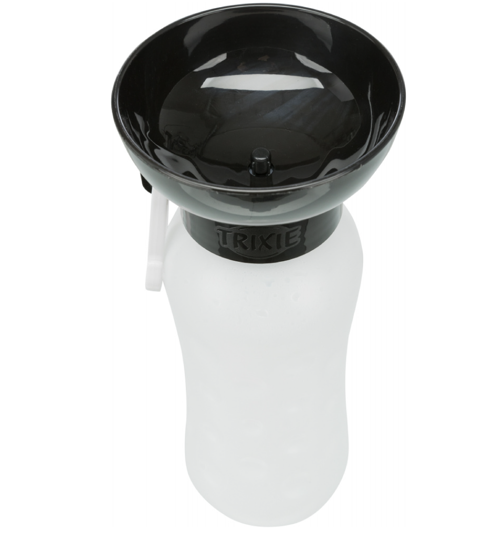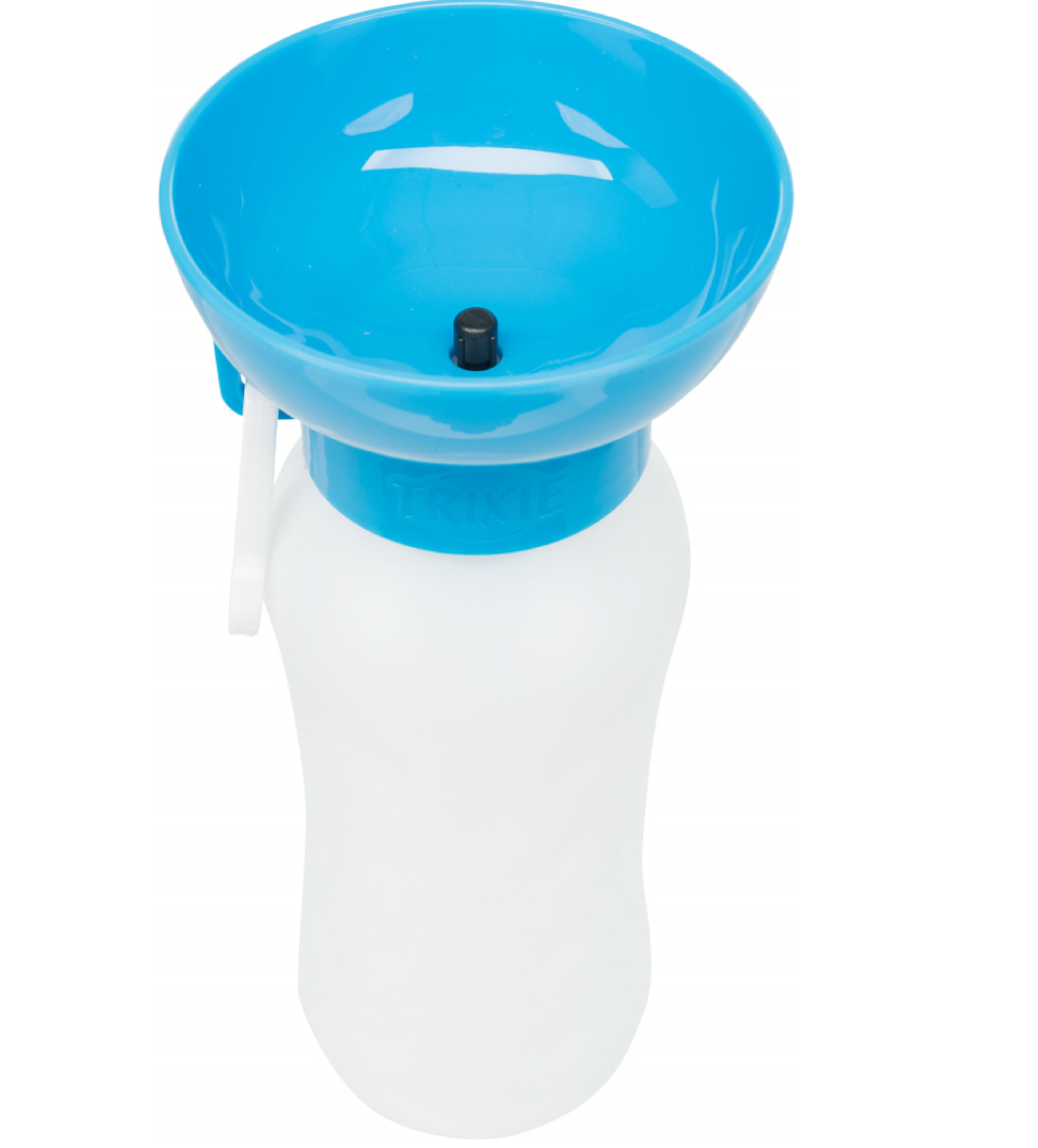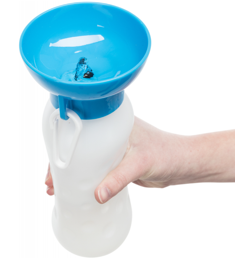 Bottiglia in plastica con ciotola nella parte superiore. Premendo la bottiglia l'acqua fluisce nella ciotola e permette al cane di bere.