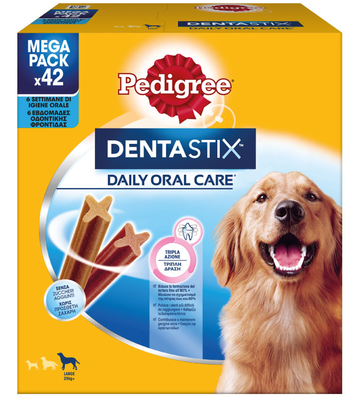 E' provato che Pedigree Dentastix riduce la formazione di tartaro fino all'80%, ciò grazie all'azione sinergica della sua composizione speciale e dei principi attivi ad azione pulente.