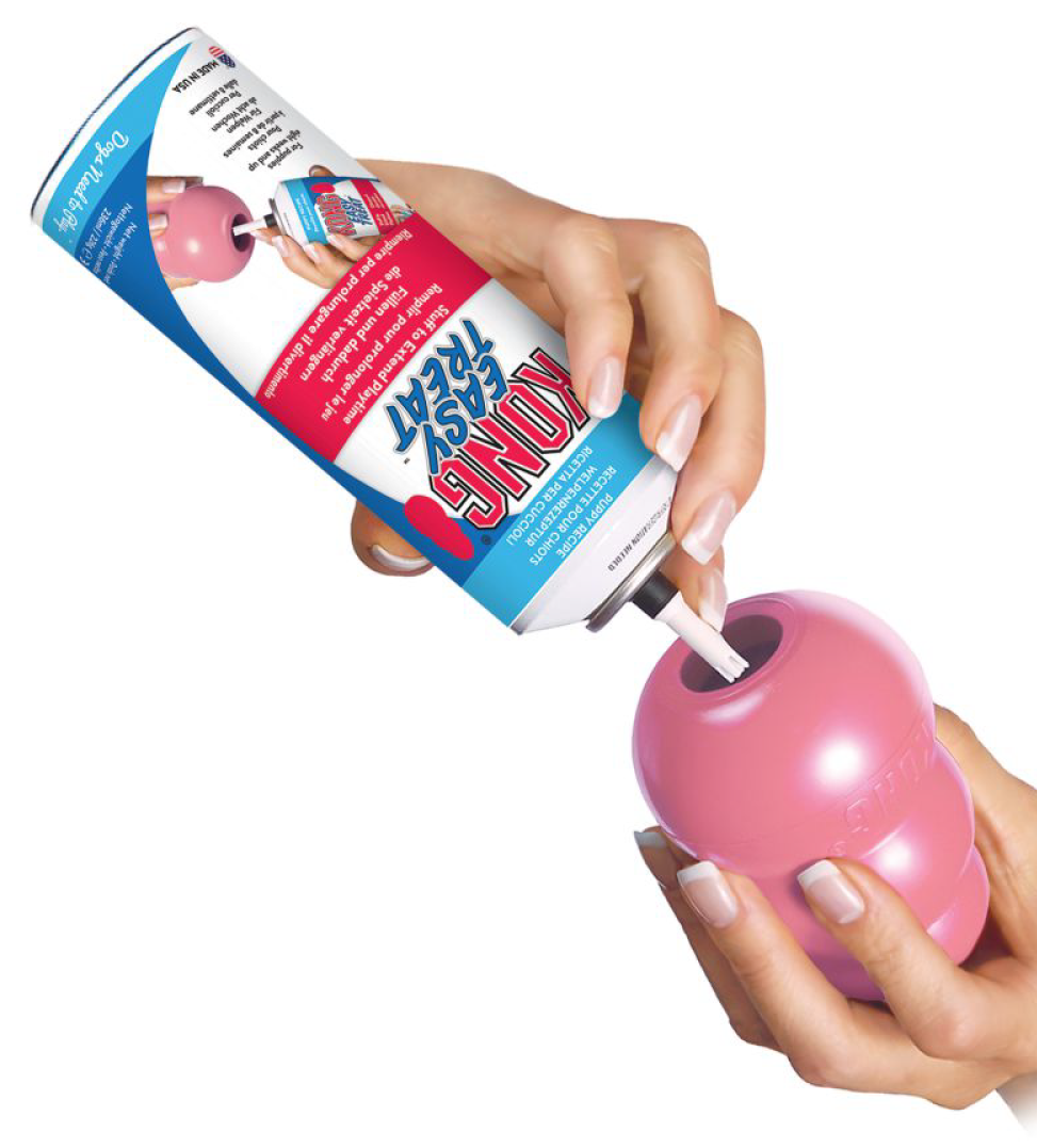 Volete agevolare l’addestramento al trasportino o prolungare il tempo di gioco? Riempitelo di croccantini per cuccioli o di Kong Snack e completate con Kong Easy Treat.