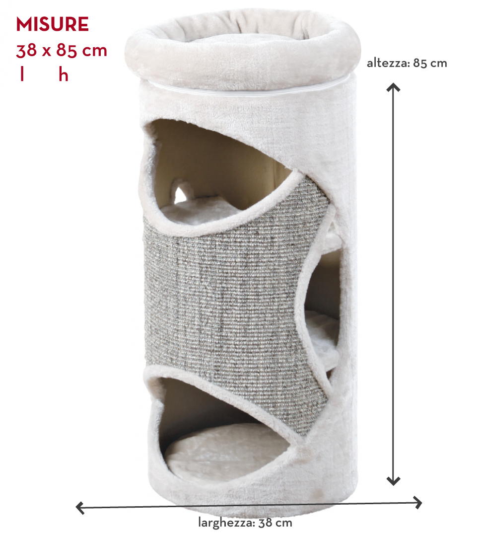 La misura di questo tiragraffi è: area della base con diamentro 38 cm; l'altezza complessiva è di 85 cm.