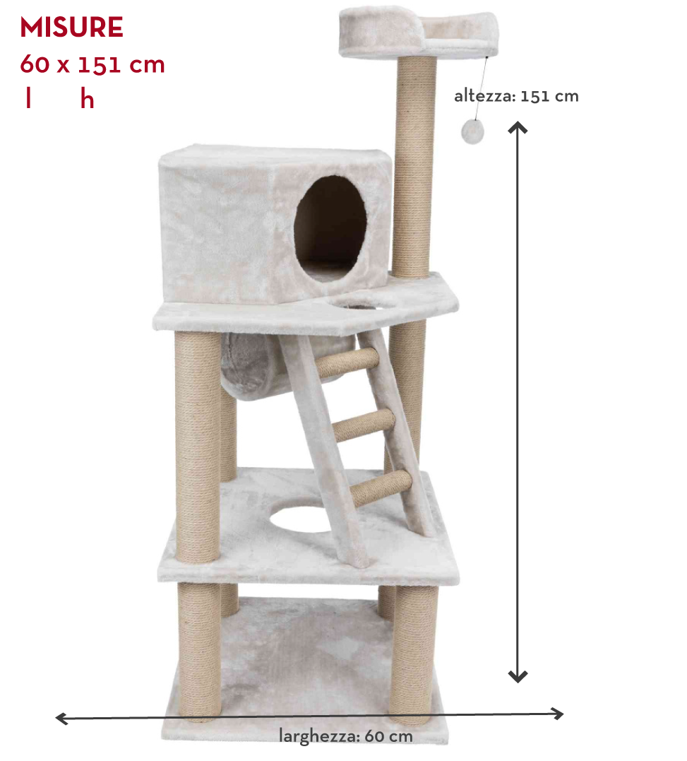 La misura di questo tiragraffi è: area della base 60x60 cm; i tronchetti hanno diametro di 9 cm; l'altezza complessiva è di 151 cm.