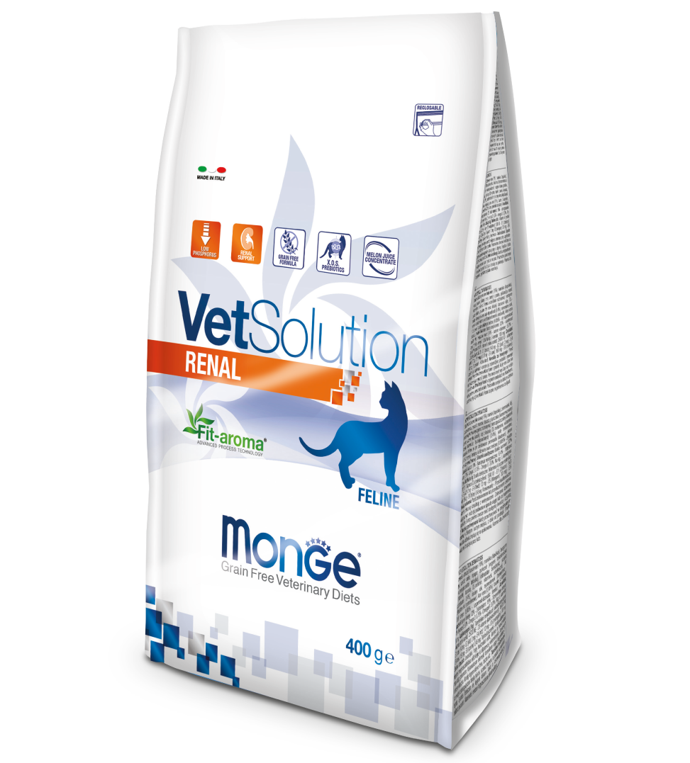 Contiene concentrato di succo di melone per neutralizzare i radicali liberi, tè verde per il supporto renale, Xilo-oligosaccaridi (XOS) per preservare il microbiota intestinale e la formulazione è caratterizzata da proteine di alta qualità e ridotto tenore di fosforo e proteina grezza.