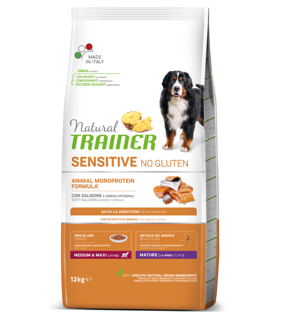 Proteine disidratate di salmone 12% , granturco integrale 11,5% , riso , fioretto di granturco , piselli , proteina di granturco , salmone 6,5% , riso integrale 4,5% , farinaccio di riso , olio di granturco , grasso di origine animale , semi di lino* 2.8% , aroma senza proteina animale, sostanze minerali , estratto secco di radice di cicoria (fonte di inulina)* 0,7% , lignocellulosa , estratto secco di gambo d'ananas* 0,1% , alga marina 0.08% , *Ingredienti specifici di origine naturale.
