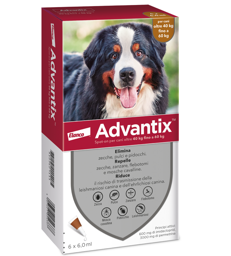 Advantix Spot On sono gocce antiparassitarie per cani da 40 a 60 kg specializzato nella protezione e nell’eliminazione di pulci, zecche, zanzare, pappataci, pidocchi e mosche cavalline.