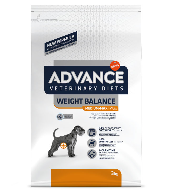 Advance Veterinary Diets Weight Balance è un alimento dietetico completo per cani adulti di taglia mini formulato per ridurre l'eccesso di peso e regolare il metabolismo lipidico in caso di iperlipidemia, caratterizzato da bassi livelli calorici, basso contenuto di grassi e alto contenuto di acidi grassi essenziali.