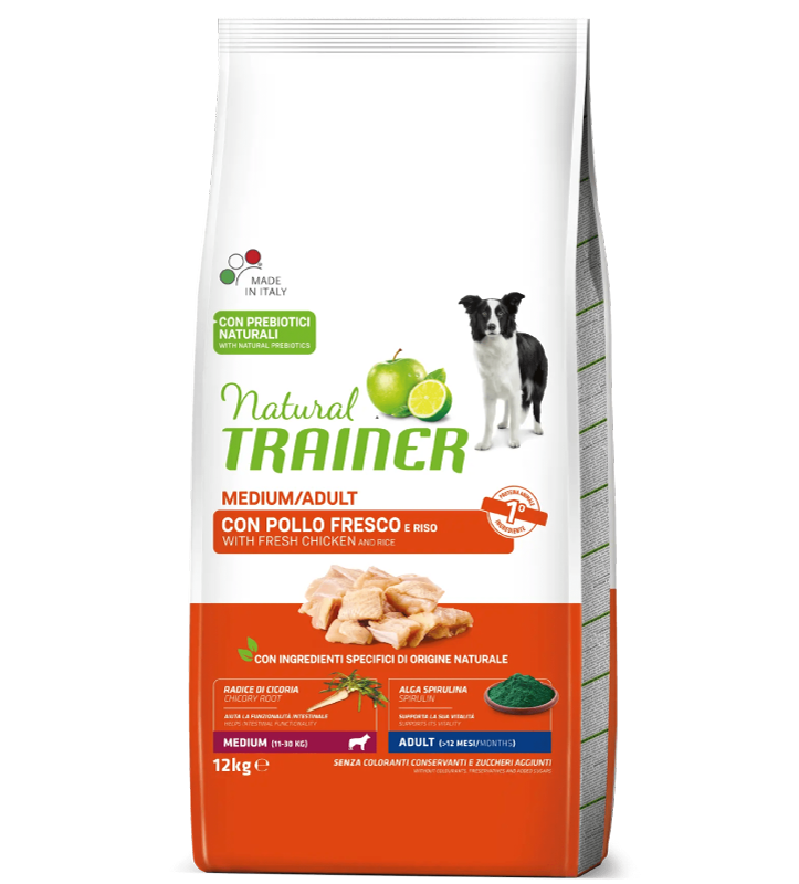 Pollo fresco, granturco, proteine disidratate di pollo e tacchino, fioretto di granturco, riso 10%, proteine disidratate di prosciutto crudo 100% italiano 4,5%, grasso di origine animale, proteina di granturco, proteine animali idrolizzate, semi di lino*, polpa di barbabietola* 2%, autolisato di lievito 0,75%, estratto secco di radice di cicoria (fonte di inulina)* 0,7%, olio di granturco, sostanze minerali, lignocellulosa, mela disidratata in polvere* 0,15%, concentrato di limone in polvere* 0,1%, spirulina (Arthrospira platensis)* 0,1%.